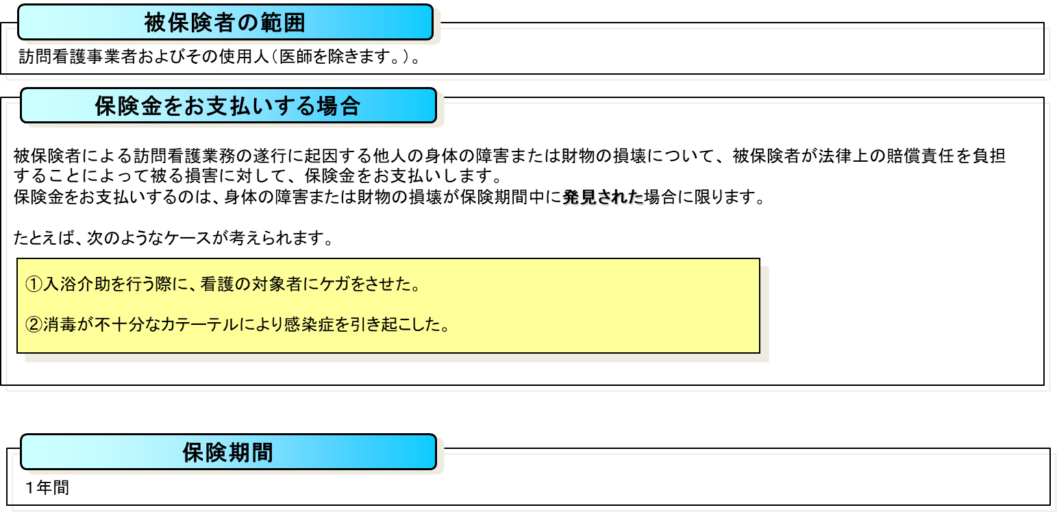 訪問看護事業者賠償責任保険は、訪問看護事業者が、訪問看護業務の遂行に起因して発生した他人の身体の障害または財物の損壊について負う法律上の賠償責任を補償する保険です。